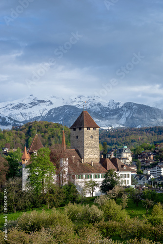 © Wirestock, Fototapeta premium Scenic view of rural mountains with foreground trees and a tall building