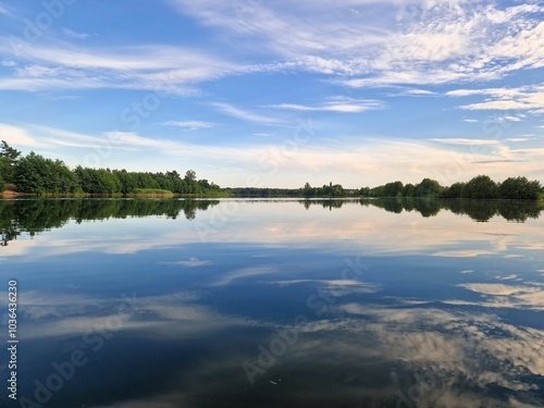 © Wirestock, Fototapeta premium Scenic view of Scharmutzelsee with lush greenery along the shore