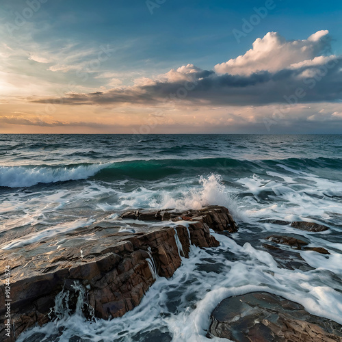 © Tarikulsio, Obraz premium Scenic view of sea against sky background. Ai generative