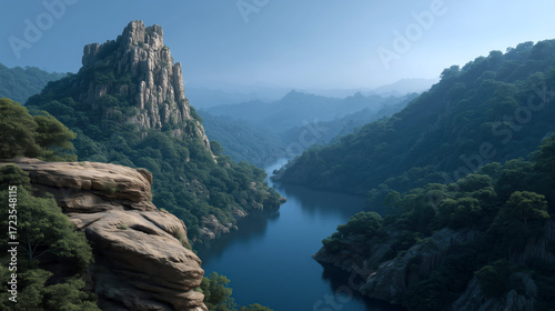 © OHMAl2T, Naklejka premium Scenic View of Serene Lake Surrounded by Cliffs at Golden Sunset