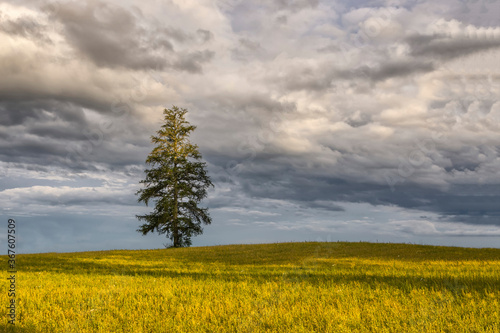 © juriskraulis, Obraz premium Scenic view of single lonely tree in green wheat field on partial cloudy stormy weather spring day.