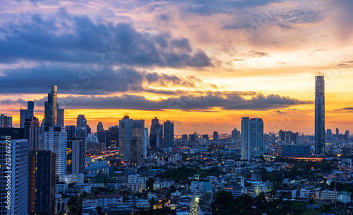 © bank215, Fototapeta premium scenic view of sunrise cityscape in metropolis and cloudscape