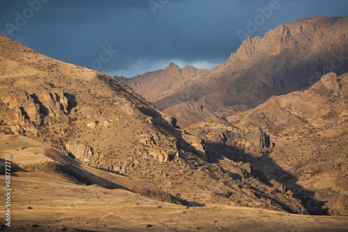 Fototapeta premium Scenic view of sunset over a mountain peak on a cloudy day