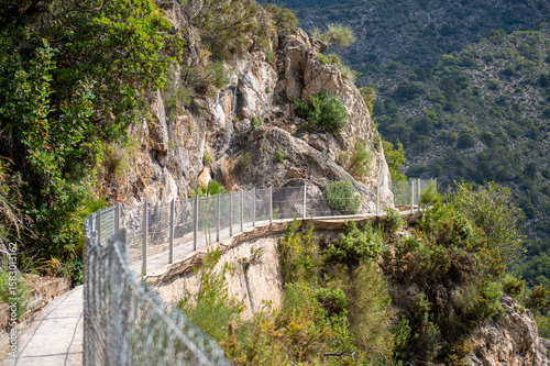© Vitali, Fototapeta premium Scenic view of surrounding mountains and picturesque village from a hiking trail along an old irrigation ditch in Frigiliana, Spain.