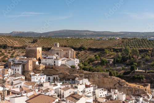 Naklejka premium Scenic view of the beautiful andalusian white town of Setenil de las Bodegas in the Natural Park of Grazalema mountain range at daylight, Cadiz province, Andalusia, Spain