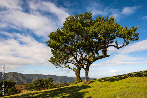 Obraz premium Scenic view of the landscape at Fanal, Madeira, under a beautiful blue sky with some clouds, with two of the famous ancient stinkwood laurel trees, Laurissilva Nature Reserve