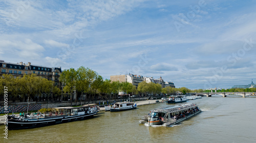 Naklejka premium Scenic view of the Seine river with tour boats and Parisian architecture, ideal for travel, tourism, and French culture themes