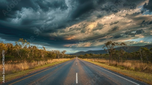 © Matcha_09, Fototapeta premium Scenic view of the straight path of Matilda Highway under a moody cloudy sky in Queensland