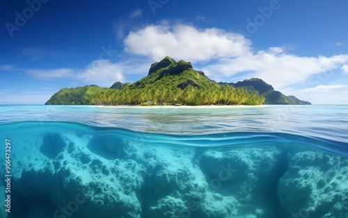 © kamon, Fototapeta premium Scenic view of tropical island with lush greenery and clear blue waters, showcasing underwater marine life under a sunny sky.