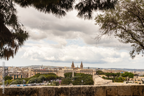 © Evelyn, Obraz premium Scenic view of Valletta, Malta. A panoramic cityscape of Valletta framed by trees, featuring historic architecture, lush gardens, and church towers under a cloudy sky.