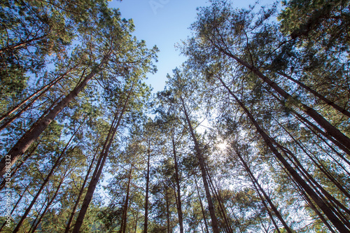 © Phongsak, Fototapeta premium Scenic view of very big and tall pine tree with sun light in the forest when looking up.