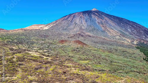 © Chris, Fototapeta premium Scenic view on volcano Pico del Teide seen from Riscos de la Fortaleza, Mount El Teide National Park, Tenerife, Canary Islands, Spain, Europe. Hike via La Canada de los Guancheros dry desert plain