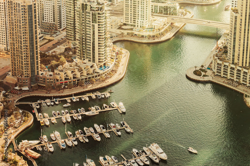 © Funny Studio, Obraz premium Scenic view over Dubai Marina harbor with boats and yachts. Summer travel background.