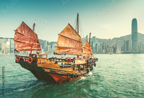 © Funny Studio, Obraz premium Scenic view over Hong-kong skyscprapers and a junkboat sailing. Iconic landmark of Hong-Kong.