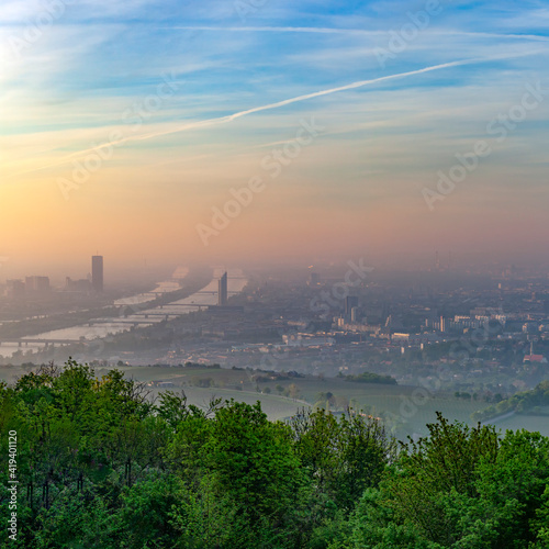 Fototapeta premium scenic view to Vienna and river Danube in dawn