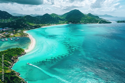 © Olena, Fototapeta premium Scenic Viewpoint of Panoramic Lagoon and Green Mountains, Captured by Drone