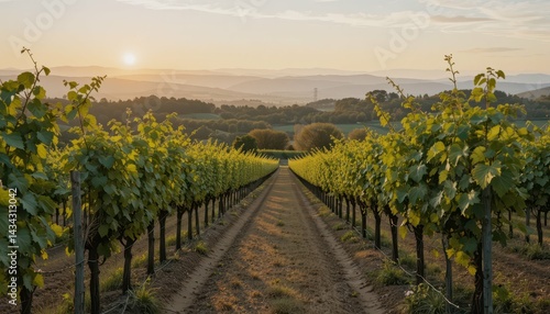 © Kitta Studio, Fototapeta premium Scenic Vineyard Landscape at Sunset with Glowing Horizon and Rows