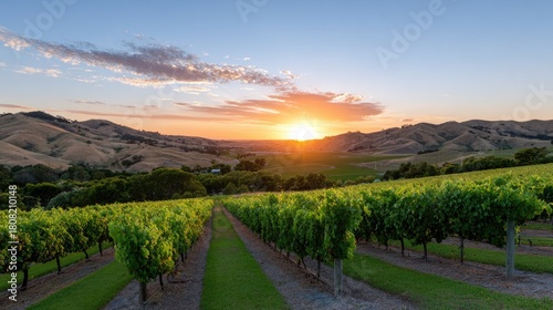 Naklejka premium Scenic Vineyard Landscape at Sunset with Lush Green Grapevines in Serene...