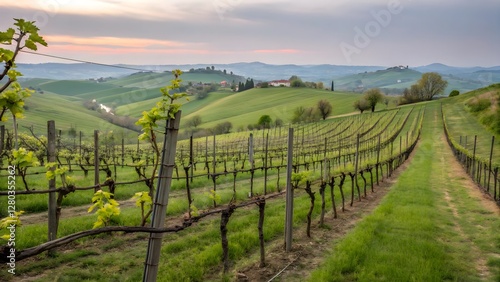 Naklejka premium Scenic Vineyard Landscape – Rolling Hills and Lush Green Vines