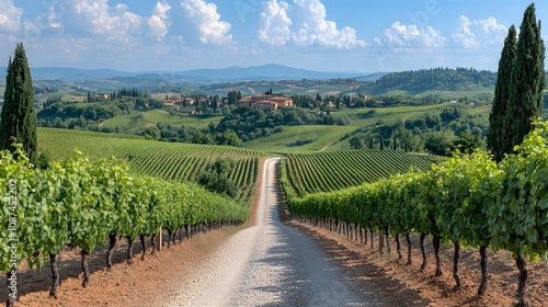 Fototapeta premium Scenic vineyard landscape with a gravel road and distant hills under a blue sky.