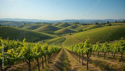 Fototapeta premium Scenic vineyard landscape with lush green grapevines rolling over gentle hills under a clear sky