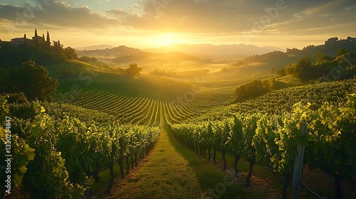 Naklejka premium Scenic Vineyard Landscape with Rolling Hills, Mist, and a Golden Sunrise Over...