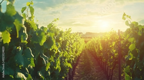 Fototapeta premium Scenic vineyard under the summer sun, with lush green vines. Space for copy...
