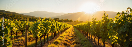 © Andrey, Naklejka premium Scenic vineyard with rows of grapevines during a sunny day