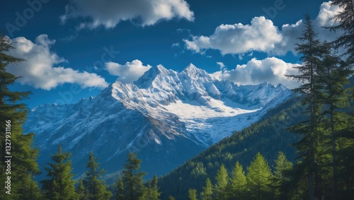 Fototapeta premium Scenic vista of snowy peaks alongside evergreen forest