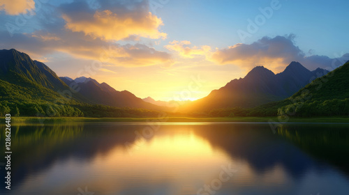 © Panupan, Fototapeta premium scenic vista showcasing expansive mountain range at sunset, reflecting beautifully on calm lake. vibrant colors of sky create serene atmosphere