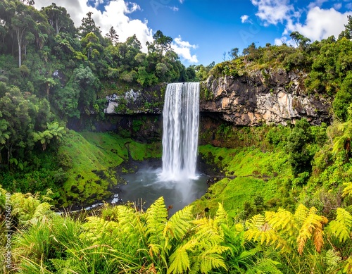 © Ratih, Fototapeta premium Scenic waterfall cascading down a cliff face surrounded by lush greenery