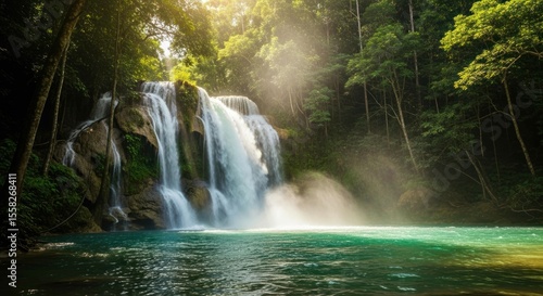 Obraz premium Scenic waterfall cascading into vibrant pool surrounded by lush forest