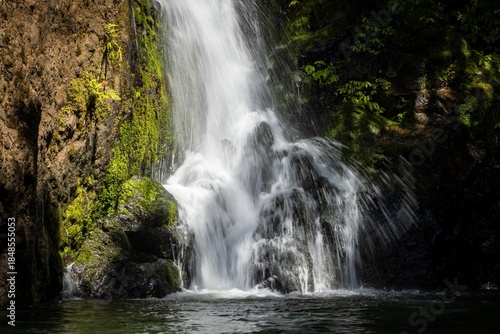 Fototapeta premium Scenic waterfall flowing down a rock face covered in green moss and plants....