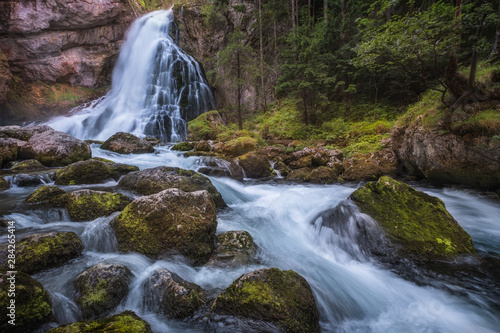 Fototapeta premium Scenic waterfall landscape with green moos stones and flowing river at beautiful summer day in Gollinger, Austria.