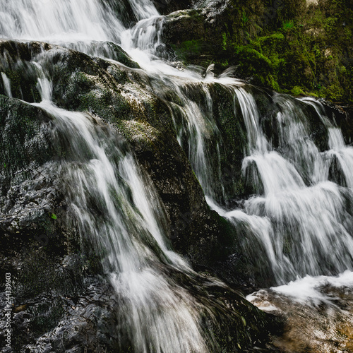 Fototapeta premium Scenic waterfall on mountain river in summer forest. Travel along river.