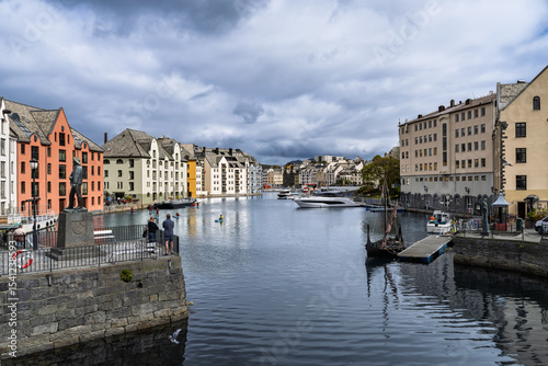 © Frankix, Naklejka premium Scenic Waterfront View of Colorful Buildings Along a Canal with Boats, Aalesund, Norway
