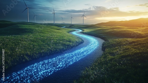 © Atmospheric stock, Fototapeta premium Scenic wind farm and meandering river at sunset with renewable energy focus