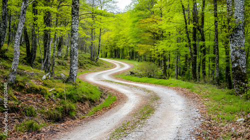 Fototapeta premium Scenic Winding Dirt Road Through Lush Spring Forest