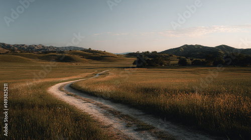 © Sadia, Fototapeta premium Scenic winding path through grassy hills at sunset in a tranquil landscape