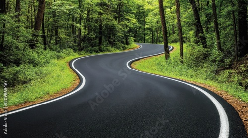 © 69, Obraz premium Scenic Winding Road Surrounded by Lush Green Forest Landscape