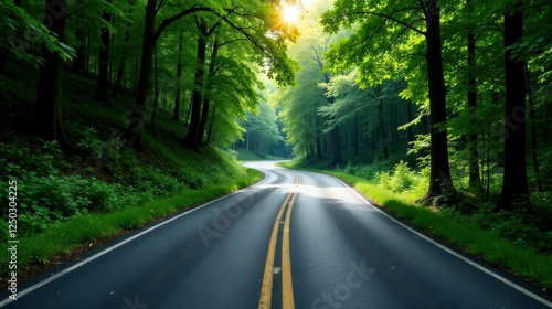 Obraz premium Scenic winding road through a lush green forest canopy bathed in sunlight
