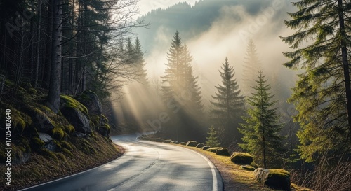 Naklejka premium Scenic winding road through a misty forest sunbeams filtering through the...
