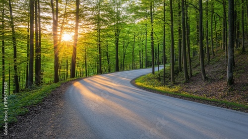 © RABBI, Obraz premium Scenic Winding Road Through Lush Green Forest at Sunset