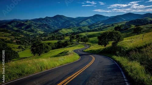 Fototapeta premium Scenic winding road through lush green hills under a clear blue sky in the...
