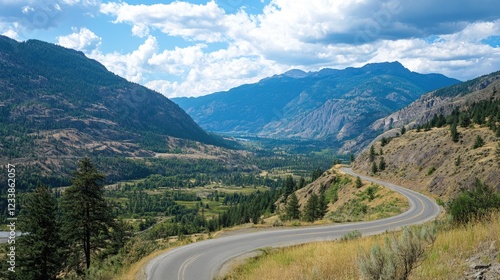 Naklejka premium Scenic Winding Road Through Lush Mountain Landscape Under Blue Sky and Fluffy...