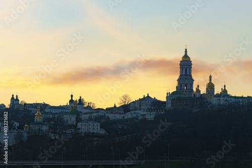 © evgenij84, Fototapeta premium Scenic winter landscape view of famous Kyiv's hills against cloudy sky during sunset. Scenic landscape of ancient Kyiv Pechersk Lavra. It is a historic Orthodox Christian monastery. Kyiv, Ukraine