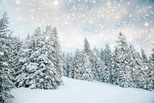 Fototapeta premium Scenic winter landscape with snowy fir trees. Winter postcard.