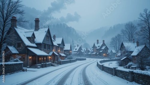 © Kitta Studio, Fototapeta premium Scenic Winter Village Under Snowy Sky at Dusk Near Mountains
