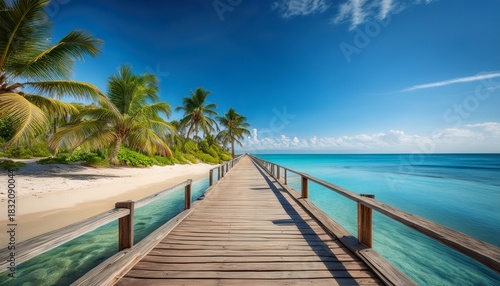 © Jessica, Obraz premium scenic wooden boardwalk leading to tranquil beach with palm trees inviting visitors to enjoy the serene coastal landscape and clear blue waters
