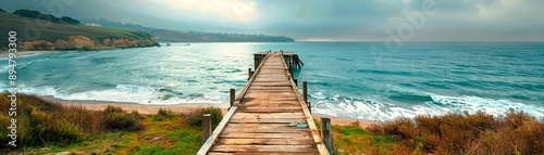 Obraz premium Scenic wooden pier extending into calm sea under a cloudy sky, perfect for...